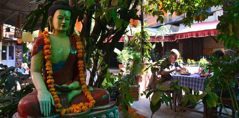 Основное блюдо называется дал бат - варёный рис с и овощами под соусом карри. Причем заказав один раз, можно бесплатно брать добавку - вам будут подкладывать, даже не интересуясь, хотите вы или нет. Другое национальное блюдо - момо. Похоже на пельмени. Готовится на пару. Из мяса здесь в основном едят курятину и баранину, иногда буйвола и яка.