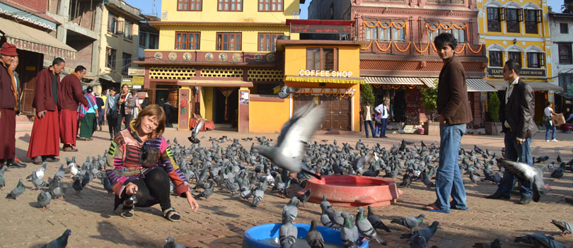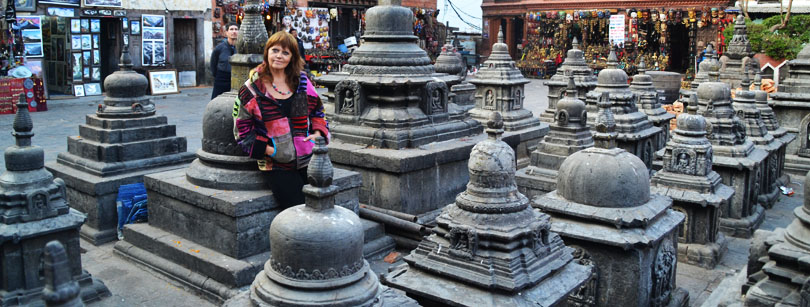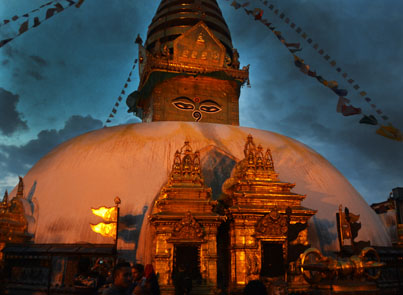 Древнейший (более двух тысяч лет) буддийский храмовый комплекс. На гору к нему ведут 365 каменных ступеней. Купол на квадратном основании олицетворяет небо, сам куб - символ земли. Выше шпиль из 13 ступеней, по числу шагов к просветлению. Наверху ступы - символ Солнца и Луны. Горят свечи, развеваются красные, синие, жёлтые, белые и зелёные флажки. С белой стены ступы смотрят глаза Будды. Вокруг главной, большой ступы с два десятка маленьких ступ и средних.