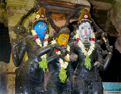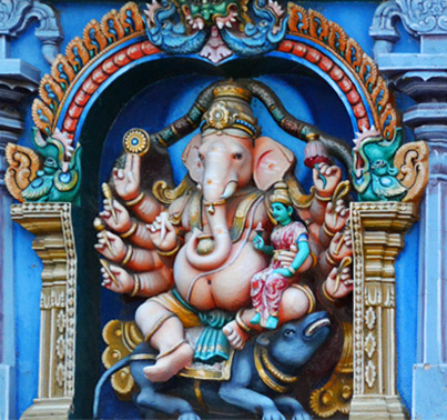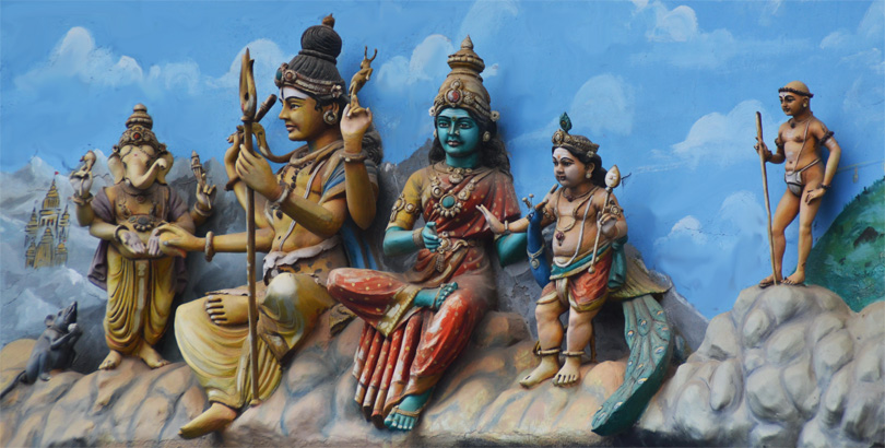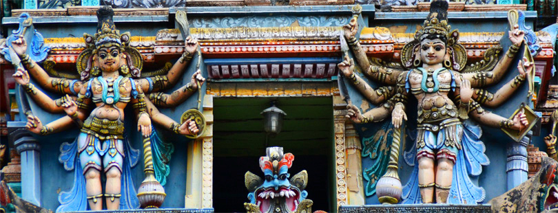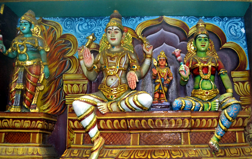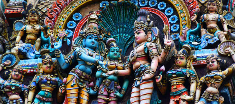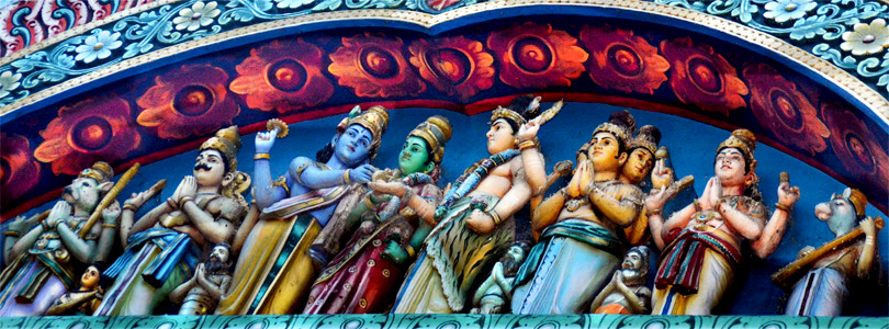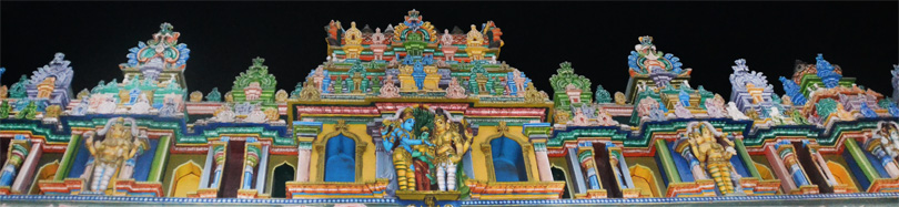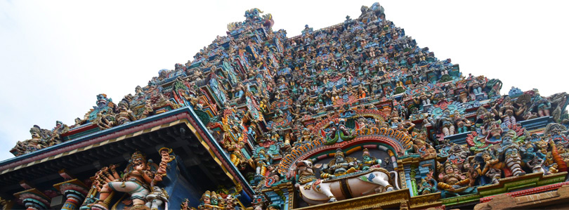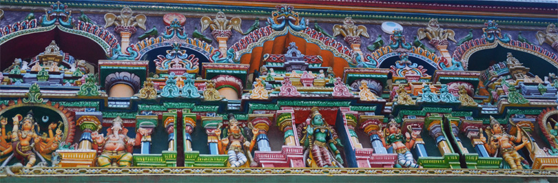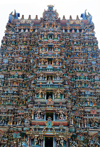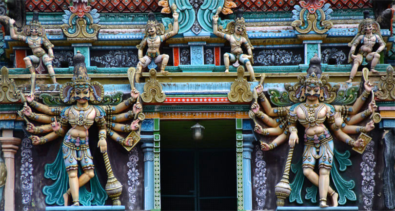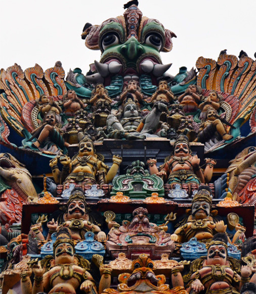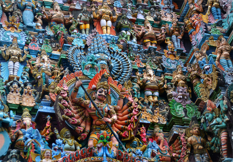 Все башни полностью покрыты тысячами разрисованных фигур, ни одна из которых не похожа друг на друга. Можно часами любоваться этими скульпурами, распознавая в них божественную историю. Здесь и многорукие Шивы, и многоликие богини, и жрецы, музыканты, мифические животные…