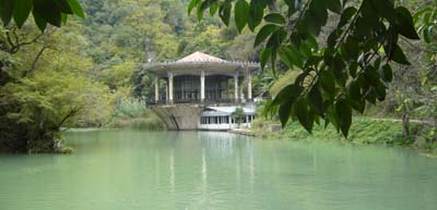 А пока наслаждаемся необычайным видом. Рассказывали странную историю. Говорят, что у некоторых людей, фотографировавших этот водопад, на самом верху, там, откуда падает вода, на фото проявилась фигура монаха. Кто знает, какие духи обитают здесь. Но то, что в этом месте возникают самые благожелательные ощущения, сомнений нет. Река, куда стекают воды водопада, одета в каменные берега, всюду мостики. Самый большой, основной водопад, длиной не менее двадцати метров. Кстати, вверху есть нечто площадки, куда можно забраться и сфотографироваться снизу. Уникальные получаются фото. Рядом каменная лестница, ведущая вверх, за водопад, к необычайно голубому озеру, с гладкой, зеркальной водой, с красивой набережной, служащей одновременно и вокзальным перроном бывшей станции. Здание станции необычайно. Оно все состоит из стекла и резных дверей, оконных переплетов. К сожалению, почти все стекла выбиты. Станция давно не функционирует, здание заброшено. Но удивительно, словно живой дух озера поселился в нем. Потому что здание вовсе не выглядит покинутым, даже больше – оно возвышается, нависая над сказочным лесным озером, так необыкновенно гордо, что проникаешься какой-то живой теплотой к этому месту. Множество тропических растений по берегам озера создают таинственность.