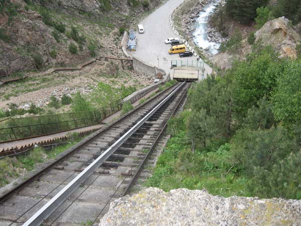 Машина (в том числе грузовая) ставится на платформу и с помощью тросов все это сооружение затягивается вверх. До 2010 года людей тоже поднимали таким образом. Но потом запретили. Вот и приходится теперь тащиться по крутым ступенькам более сотни метров.