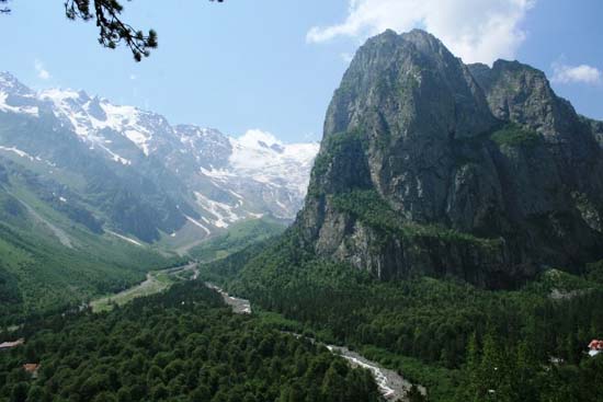 Мы едем дальше. И вот уже селение с экзотическим названием Бурон остается позади. И наш путь на запад – в красивейшее место Северной Осетии – Цейское ущелье или Цейская Котловина - место, со всех сторон окруженное суровыми скалами. Его называют Подковой Счастья. Переехав по мосту на левый берег Ардона, начинаем подъем по дороге. На первом серпантине, слева, нас приветствует скульптура персонажа осетинского эпоса - Афсати, покровителя живых существ. Ведь Цейское ущелье является государственным заповедником, и фигура покровителя на въезде символизирует защиту всего живущего в этом уголке Кавказа. Дорога понемногу набирает высоту, петляя по серпантину. Голые невысокие склоны сменяются сосновым лесом. Вот справа появляется родник. Мы останавливаемся, потому что невозможно удержаться: перед нами великолепная панорама всего ущелья и самого Цейского ледника. С севера ущелья Цейские горы, с юга - скалы отрогов Адай-хоха (4410 м.). Река Цейдон. Огромные валуны. Слышится грохот – это мечутся воды горной реки. Начинаются леса. Могучие сосны, жители ущелья, как стрелы врезаются в небо. Если смотришь на горы издалека, они напоминают лоскутный ковер – темно-зеленые островки перемежаются со светло-зеленой листвой. То сосны с темно-зелеными буками и светлые кроны кленов и лип. Говорят еще, что в этих лесах сохранились редчайшие виды растений, которых нет больше нигде в мире. |