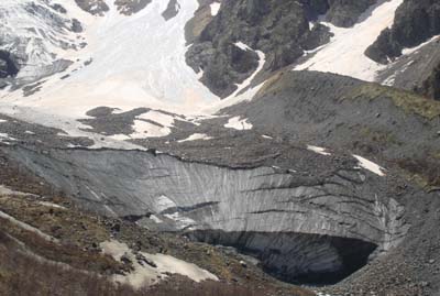 На следующий день мы отправились в самую сердцевину Цейского ущелья к Цейскому леднику. Путь был неблизким. И большей частью проходил по лесным тропам через сосновый лес, бурелом, вдоль реки Цейдон – вперед, к хрустальному гроту, похожему на сказочный. А дальше – шестикилометровый «язык», засыпанный камнем, испещренный трещинами, журчащими ручьями талой воды. В конце его - обширный Северный цирк.