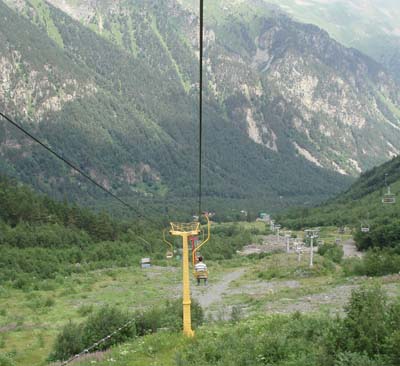 Сказское ущелье можно считать младшим братом Цейского. Канатная дорога – и ты словно плывешь в вышине ровно посередине ущелья. И кажется – все рядом. Абсолютное ощущение – словно протянешь руку и коснешься горы… Слева, справа горы, вдалеке ледник и покрытый снегом перевал. И кажется, что ты не в небе, а уже на вершине горы… Все похоже на какой-то локальный, очень домашний мир… И в никуда уходит то, что существует за границами этого мира. Так, словно больше вообще ничего нет – только этот воздух, скалы, снег, а внизу расцветающие рододендроны, сосны, начинающая зеленеть трава, сверкающая хрустальными бликами речка…И вот верхняя станция на высоте 2500 м, ты спрыгиваешь с кресла канатки, и все горы словно рванули ввысь – и обступили тебя со всех сторон – необыкновенно величественные – огромные длинные хребты с острыми вершинами – отвесные, мощные. |