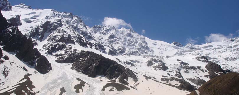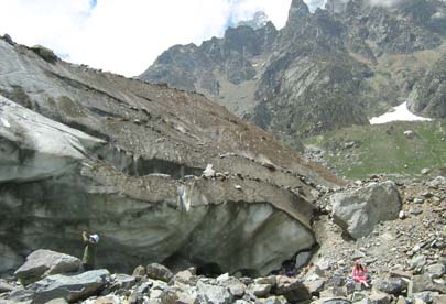 Ты оборачиваешься назад – и перед тобой все ущелье. И внизу та самая гора «Монах». Говорят, если присмотреться, можно разглядеть на скалах горных туров. Справа – длинный хребет морены. Мы поднимаемся по тропе вверх примерно на километр по хребту ледникового ложа. Добираемся до места, откуда видел сам ледник – так близко, что можно рассмотреть его весь с суровым нагромождением ледопада из острых, как иглы, 10-15 метровых льдин. |