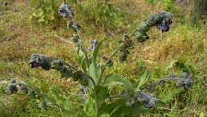 А называется это растение песий язык, или чернокорень. Лечит оно болезни легких, грибковые заболевания, мокнущие экземы между пальцев, зудящие высыпания, герпес, потливость. Иногда бывает достаточно несколько раз пропарить больные места в отваре чернокорня, чтобы прошли все пятна, витилиго, псориаз. Для приготовления отвара 2 ст. ложки корней заливают 1 литром воды. |
