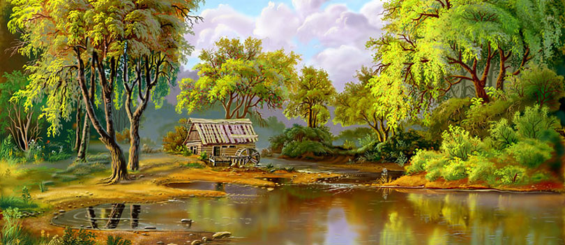Щука поплыла к дальнем пологому берегу, а за ней вся ее свита - рыбки большие и маленькие. Выбросилась щука на берег и стала острыми зубами срывать растущие у воды цветки, бросая их в воду. А другие рыбешки их подбирали. И... вскипела вода от рыбьей работы, каждая рыбка старается изо всех сил, как будто хороводы под водой.
