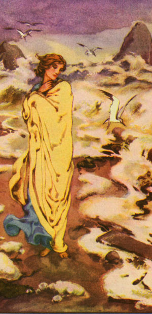 Сыном Эосфора был юный Кеик, а его женой была дочь бога Эола - прекрасная Алкиона. Решил отправиться Кеик в далекий Кларос к оракулу через море и пообещал любимой жене вернуться домой, прежде чем луна обновится два раза. Но тяжко стало на душе у Алкионы, не хотела она отпускать мужа, плакала горькими слезами, боясь, что муж погибнет. Смотрит Алкиона глазами полными слез на уходящие вдаль паруса и прощается с милым. И вот - поднялся ветер, налетел на корабль шторм. И только о своей любимой Алкионе стал молиться Кеик. И вот уж тонет корабль. Кеик ухватился за кусок доски, прося богов о том, чтобы волна донесла его до родного берега, чтобы там его тело было погребено любимой. А Алкиона тоже обратилась с мольбою к богам. И вот богиня Гера повелела Морфею отправиться к страдающей Алкионе и поведать ей о гибели Кеика. Дала ему пару нежных фиолетовых цветков. Ей стало жаль, как она убивается в горе. Положил незаметно Морфей цветки под подушку Алкионы и приснился ей сон, что Кеик погиб, но тело его уже у берега. Побежала проснувшаяся Алкиона к берегу, нет - она полетела, едва касаясь земли, и вдруг превратилась в птицу, наполняя воздух жалобными криками. Она прижимается к телу Кеика, клювом целует его. И вот - приподнялся Кеик и тоже превратился в птицу - зимородка, видно от горячих слез любимой ожил. С тех пор пара зимородков - всегда вместе. Что же за волшебные цветки приносил Морфей, что показывают вещие сны. |