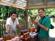 За проволочным забором были видны улики, стоящие по два на осях с колесами. Но это не постоянное их место, они всю весну и лето «кочуют» к тем полянкам, где цветут те или иные цветы. Потому и такое количество сортов. Кстати, вкусы у людей разделились. Кому-то больше понравился эвкалиптовый мед, земляничный, но особое место занял каштановый. Еще нам были предложены: прополис - великолепное средство при лечении заболеваний дыхательных путей, герпеса и прочих инфекций; маточное молочко - уникальный продукт, его используют при туберкулезах тяжелой формы, истощении, ослабленном иммунитете; перга (пчелиный хлеб) - это пыльца, утрамбованная пчелами в соты. А в глиняных горшочках с крышечками из воска находился апитонус - натуральный продукт, из высококачественного меда с добавлением пчелиного маточного молочка.