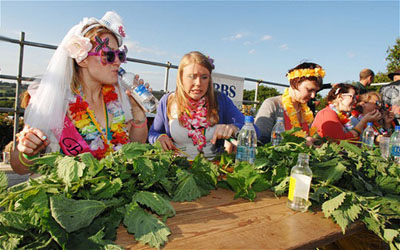 Участникам выдаются ветки крапивы длиной около 60 сантиметров. Начинается отсчет времени. Через час судьи измеряют общую длину стеблей крапивы, очищенных от листьев. Победителем становится тот, кто обглодает больше всего стеблей! А потом все веселятся и демонстрируют свои пальцы и языки коричнево-черного цвета.