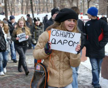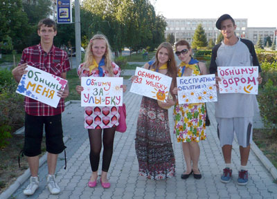 Уже не в одном городе России прошли веселые флеш-моб. Например, 1 апреля в городе Лермонтове парни и девушки с плакатами «Обниму за улыбку» улыбались прохожим и обнимали тех, кто улыбался в ответ, раздавали на память маленькие смайлики. В акции даже приняли участие и сотрудники отдела ГИБДД, они охотно улыбались и раздавали благодарности пешеходам, соблюдающим правила дорожного движения. Вся суть этой акции, хоть то и был День шуток – не разыгрывать других, а просто дарить людям хорошее настроение, делиться с ними своими улыбками и объятиями. |