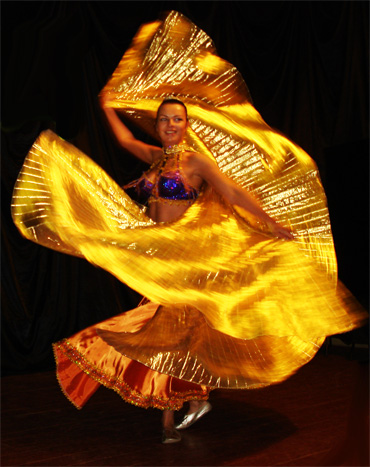 Во всем была виновата пчела. Сбитая с толку сладким цветочным ароматом, исходившим от умащенного маслами тела молоденькой плясуньи, пчела, перепутав девушку с цветком, залетела той под одежду во время представления. Чтобы избавиться от непрошенной гостьи, девушка изо всех сил стала вращать бедрами и производить движения животом. Пластичность, изящество и эмоциональность, с которыми она проделывала эти движения, привели окружающих в восторг. Так родился один из самых древнейших танцев на Земле. Так рассказывает легенда о происхождении танца живота. Когда я первый раз увидела его в исполнении профессиональной танцовщицы – красавицы арабки, я испытала непонятное волнение. Мне, тогда еще маленькой девочке, эта женщина показалась почти богиней, да и неудивительно – сказочные движения только подчеркивали физическую красоту ее стана. При этом танцевало не только ее тело, танцевали и ее мысли, обнажающие душу через чарующие глаза, подведенные сурьмой. Своими движениями эта богиня увлекла весь зал в мир своих грез. |