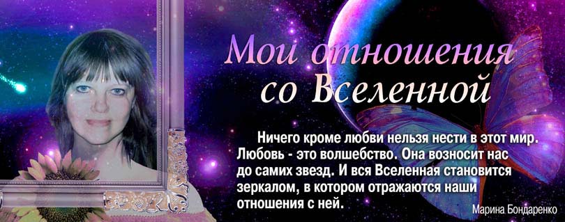 Ну а теперь пришла пора познакомить вас с ведущей этого раздела Мариной Бондаренко. Она настоящий мастер психологической помощи людям. И каждый ее совет выверен собственным опытом, свеж и оригинален. Стоит сказать и о том, что разработанная ею методика диагностики проблем и их решений, уникальна. Она основана на искусстве волшебства под названием «Мандала», которое позволяет проникнуть в мир вашей собственной души. Но об этом у нас будет отдельный разговор.