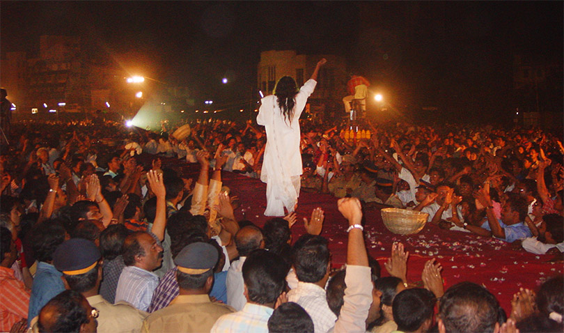 Чуть ближе к сцене тысячи людей сидели прямо на земле, подстелив под себя заранее припасенные коврики или газетки. Ну а состоятельные граждане устроились на приготовленных для них стульях. Публика терпеливо ждала появления духовной звезды, не проявляя ни нетерпения, ни нервозности.