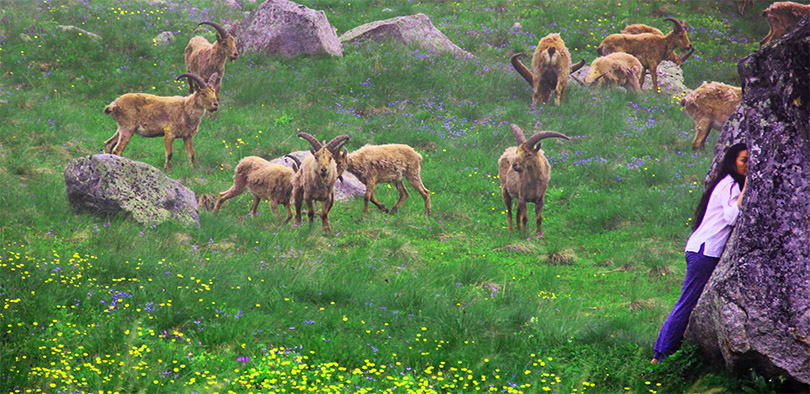 Когда подняла голову, то увидела животворящую картину: позади меня была наша группа с видеокамерами и телефонами, а впереди – целое племя диких горных туров во главе с красивейшим вожаком! Они стояли и любопытно рассматривали, изучая нас, затем начали медленно приближаться к нам. Страха во мне не было, только трепет и благоговение перед этими красивыми и свободолюбивыми животными! Возвращались к остальной группе мы уже вместе с ними, проходя параллельными дорогами вдоль горной реки. А когда соединились со всей группой, то началось живое представление! Ребята, которые не пошли с нами на поляну, организовали обед. Ну а туры величественно решили его с нами разделить! Мы кормили их хлебом и солью, а они ели и игрались друг с другом как домашние животные, будто всю жизнь жили рядом с людьми.