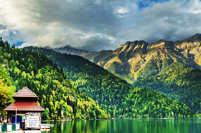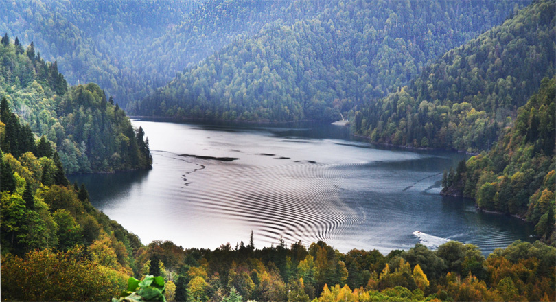 Еще одно восхитительное место, которое мы посетили вместе с нашей группой – озеро Рица. О нем слажены легенды. В тот день погода раскрылась перед нами во всем своём многообразии: дождь, ливень, а затем ярко сверкающее солнце и красивейшее прояснившееся небо сменяли друг друга. После дождя начала подниматься лёгкая дымка над водой, а когда выглянуло солнце, то озеро стало искриться и переливаться тысячами алмазов. А у самой кромки воды мягко приземлялись золотистые, опадающие с деревьев осенние листья. Легкий ветерок, будто играясь в кораблики, нежно опускал их на воду.