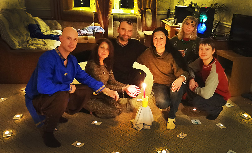 Но настоящее волшебство произошло, когда начались хороводы на улице… Очень ярко чувствовалось присутствие светлых родовичей, их одобрение и благословление. Оно проявилось в виде благостного очищающего дождя, который на наших глазах превращался в блестящие снежинки… А коло (круг) всё вращалось и вращалось, усиливая и закручивая энергию благости и света, соединяясь со звездным пространством под вечерним небосклоном. Удивительно было видеть стаи птиц. Они пролетали над нашим хороводом в уже темном ночном небе сначала в одном, а потом и в другом направлении!